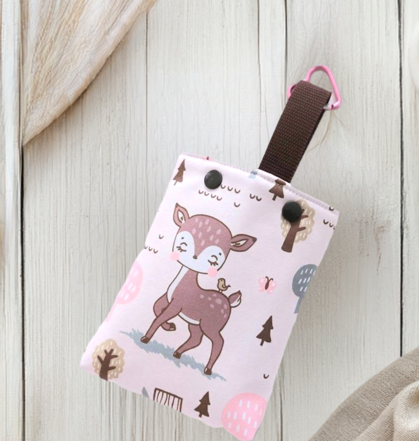 große handgefertigte Futtertasche mit niedlichen Reh Motiv. Mit dieser Futtertasche hast Du immer eine saubere Jackentasche oder Hosentasche. Die große Futtertasche besteht aus Softshell mit einem süßen Reh Motiv und innen besteht sie aus rosafarbener beschichteter Baumwolle mit weißen Pünktchen. Die Futtertasche hat eine Schlaufe und einen Karabinerhaken. Die Tasche ist durch zwei Druckknöpfe verschließbar.
