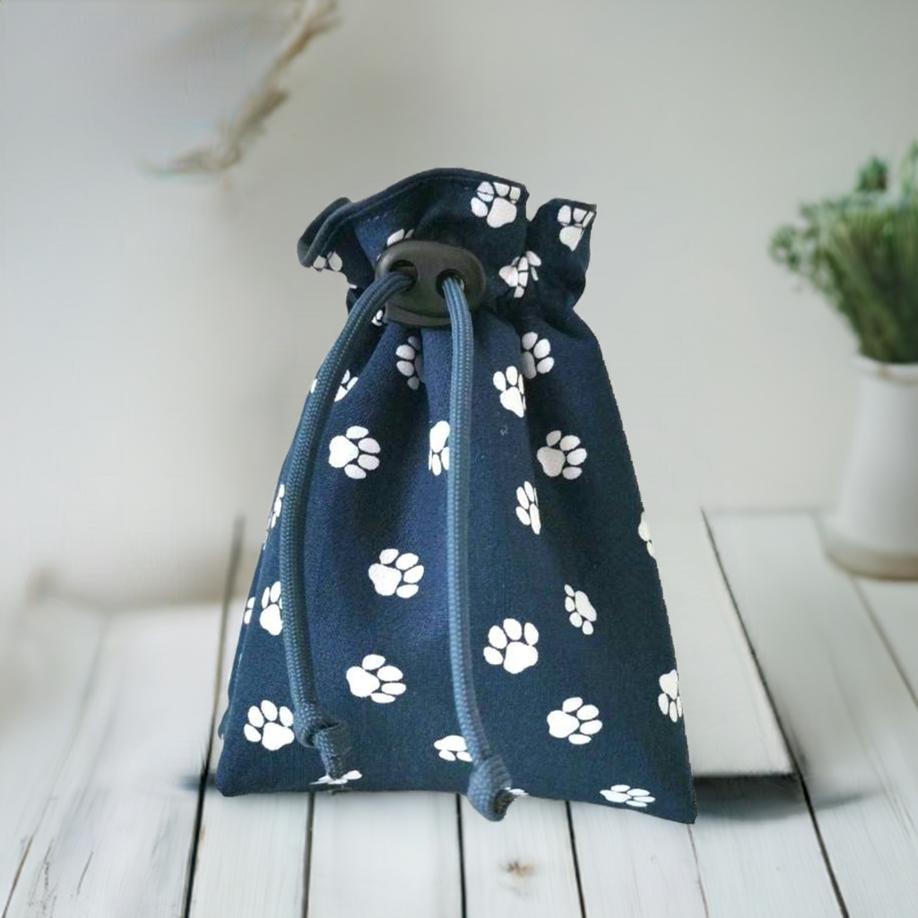 Futterbeutel perfekt Leckerli Beutel für Hunde dunkelblau mit weißen Pfoten aus Baumwolle für Hunde – ideal zum Training & Gassi