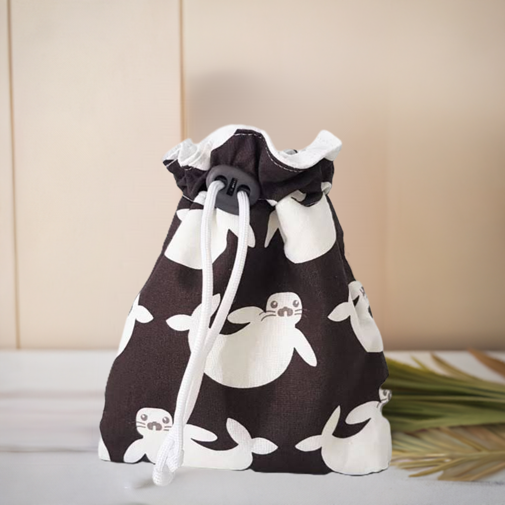 ein handgefertigter Futterbeutel braun mit Seehund Motiv. Der Futterbeutel ist verschließbar durch eine Kordel und einem Feststeller. Der Futterbeutel hat eine Schlaufe an der ein Karabiner-Haken (kann variieren) befestigt ist. Den Leckerli Beutel kannst Du gut beim Gassigehen oder Hundetraining verwenden.