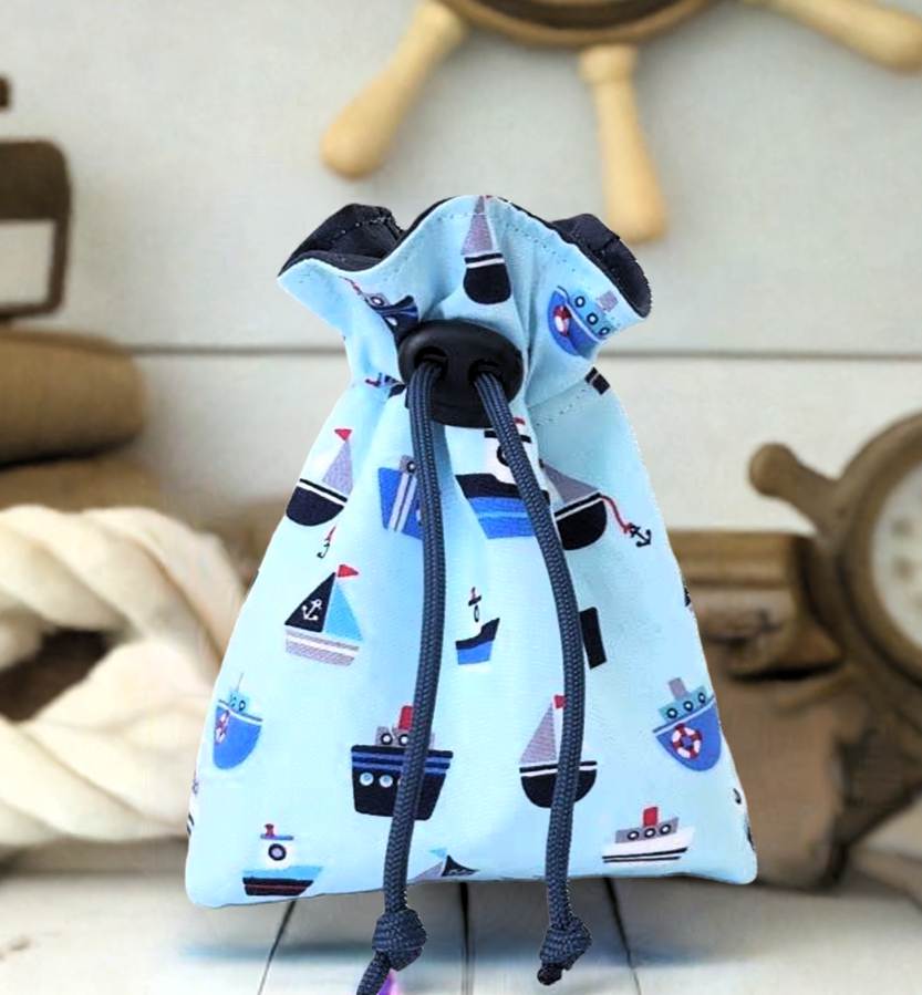ein handgefertigter Futterbeutel hellblau mit Boot und Schiffen Motiv. Der Futterbeutel ist verschließbar durch eine Kordel und einem Feststeller. Der Futterbeutel hat eine Schlaufe an der ein Karabiner-Haken (kann variieren) befestigt ist. Den Leckerli Beutel kannst Du gut beim Gassigehen oder Hundetraining verwenden.