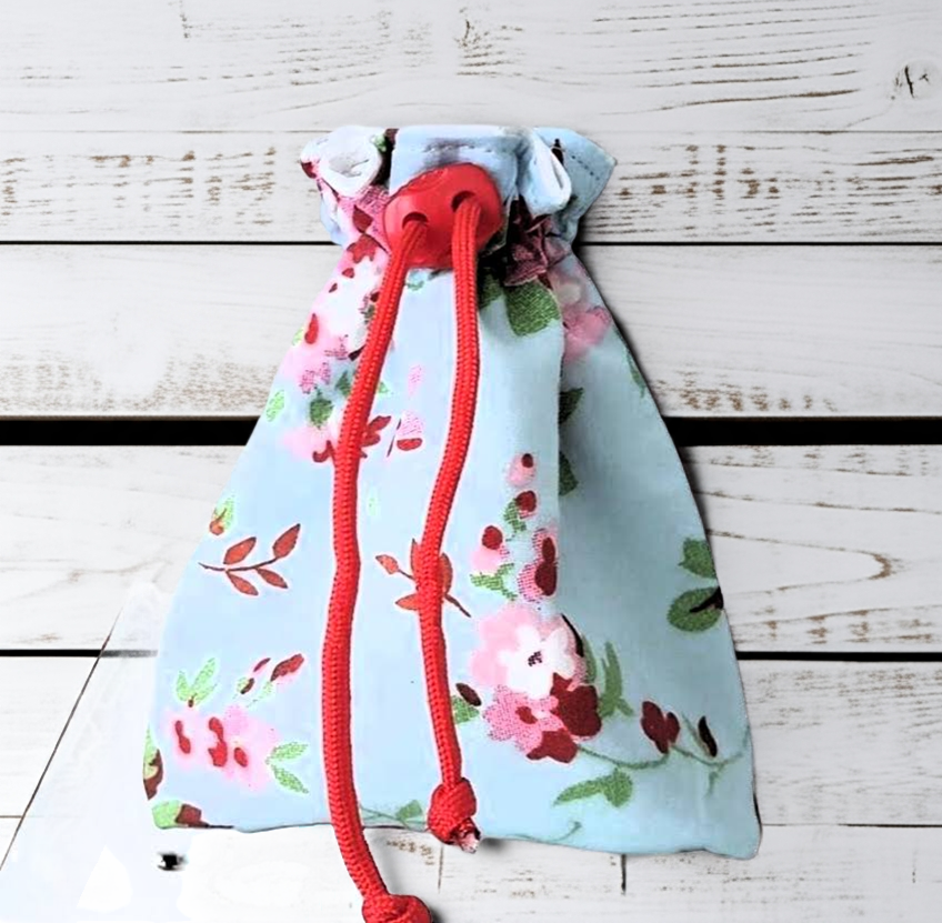 ein handgefertigter Futterbeutel aus Baumwollstoff hellblau mit hübschen Rosen Motiv. Der Futterbeutel ist verschließbar durch eine Kordel und einem Feststeller. Der Futterbeutel hat eine Schlaufe an der ein Karabiner-Haken (kann variieren) befestigt ist. Den Leckerli Beutel kannst Du gut beim Gassigehen oder Hundetraining verwenden.