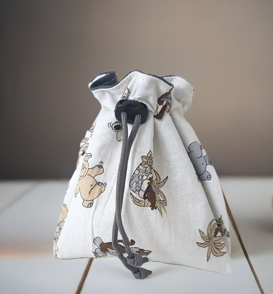 ein handgefertigter Futterbeutel beige aus Baumwollstoff mit Dschungeltier Motiv. Der Futterbeutel ist verschließbar durch eine Kordel und einem Feststeller. Der Futterbeutel hat eine Schlaufe an der ein Karabiner-Haken (kann variieren) befestigt ist. Den Leckerli Beutel kannst Du gut beim Gassigehen oder Hundetraining verwenden.