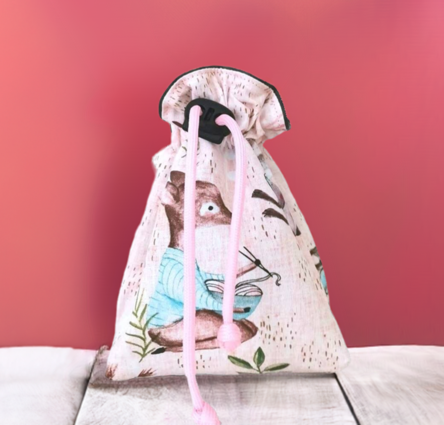 ein handgefertigter Futterbeutel Puder mit niedlichen Waldbewohner Motiv. Der Futterbeutel ist verschließbar durch eine Kordel und einem Feststeller. Der Futterbeutel hat eine Schlaufe an der ein Karabiner-Haken (kann variieren) befestigt ist. Den Leckerli Beutel kannst Du gut beim Gassigehen oder Hundetraining verwenden.