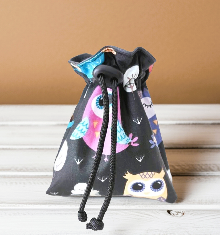 ein handgefertigter Futterbeutel schwarz mit niedlichen Eulen Motiv. Der Futterbeutel ist verschließbar durch eine Kordel und einem Feststeller. Der Futterbeutel hat eine Schlaufe an der ein Karabiner-Haken (kann variieren) befestigt ist. Den Leckerli Beutel kannst Du gut beim Gassigehen oder Hundetraining verwenden.