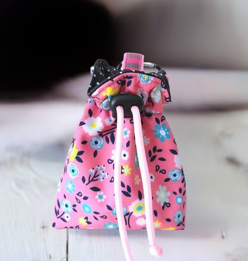 ein handgefertigter Futterbeutel rosa aus Softshell mit hübschen Blümchen Motiv. Der Futterbeutel ist verschließbar durch eine Kordel und einem Feststeller. Der Futterbeutel hat eine Schlaufe an der ein Karabiner-Haken (kann variieren) befestigt ist. Den Leckerli Beutel kannst Du gut beim Gassigehen oder Hundetraining verwenden.