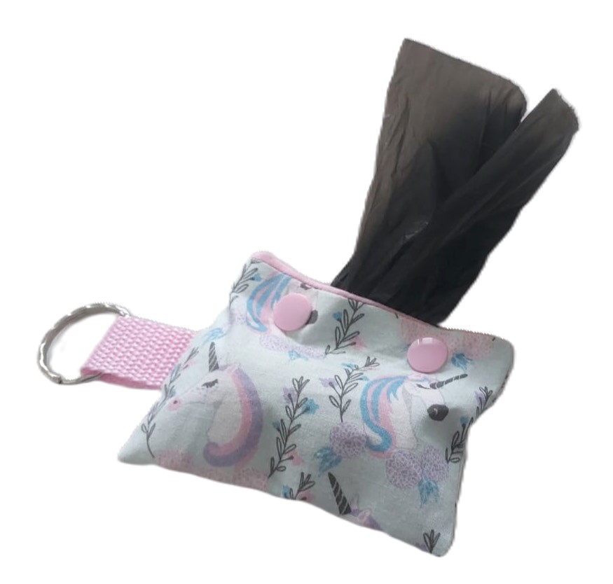 eine handgefertigte Hundekotbeuteltasche mint mit Einhorn Motiv und rosa Druckknöpfen. In den Kotbeutelspender passt genau eine Kotbeutelrolle (der Standardgröße) und so bist Du gut ausgestattet für jede Gassi runde. Mit unserem praktischen Spender bist du für jeden Spaziergang bestens gerüstet, denn die darin enthaltenen Kotbeutel helfen, die Hinterlassenschaften deines Vierbeiners hygienisch zu beseitigen und so die Natur sauber zu halten. Mit einem kleinen Schlüsselring kann der Beutelspender an der Leine, Schlüsselbund, Gürtel etc. befestigt werden. Die Tütenrolle wird durch 2 Druckknöpfe geführt. Durch die Öffnung kann man leicht eine Tüte nach der anderen herausziehen und abreißen.