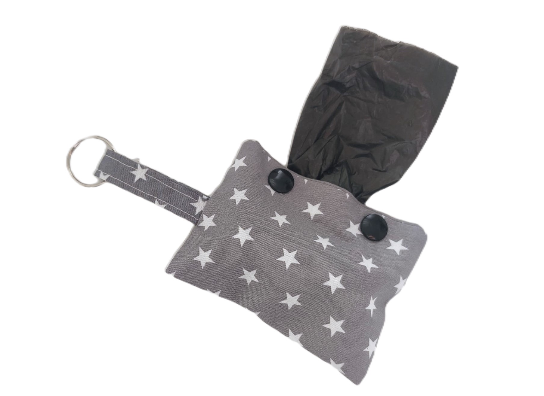 eine handgefertigte Hundekotbeuteltasche aus Baumwollstoff grau mit weißen Sternen und weißen Druckknöpfen. In den Kotbeutelspender passt genau eine Kotbeutelrolle (der Standardgröße) und so bist Du gut ausgestattet für jede Gassi runde. Mit unserem praktischen Spender bist du für jeden Spaziergang bestens gerüstet, denn die darin enthaltenen Kotbeutel helfen, die Hinterlassenschaften deines Vierbeiners hygienisch zu beseitigen und so die Natur sauber zu halten. Mit einem kleinen Schlüsselring kann der Beutelspender an der Leine, Schlüsselbund, Gürtel etc. befestigt werden. Die Tütenrolle wird durch 2 Druckknöpfe geführt. Durch die Öffnung kann man leicht eine Tüte nach der anderen herausziehen und abreißen.
