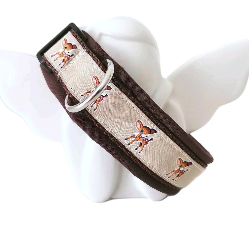 dieses süße Hundehalsband besteht aus braunen Gurtband und beigefarbenen Web band mit Reh Motiv, gepolstert ist es mit braunen Softshell.