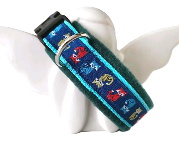 ein Hundehalsband mit türkisfarbenen Gurtband und blauen Web band mit Fuchs Motiv. Das Hundehalsband ist mit Fleece hinterlegt, so das ein angenehmes tragen gewährleistet ist. Das Halsband ist verschließbar durch eine und verschließbar durch eine Steckschnalle aus Kunststoff, die Leine kann an einem D-Ring befestigt werden.