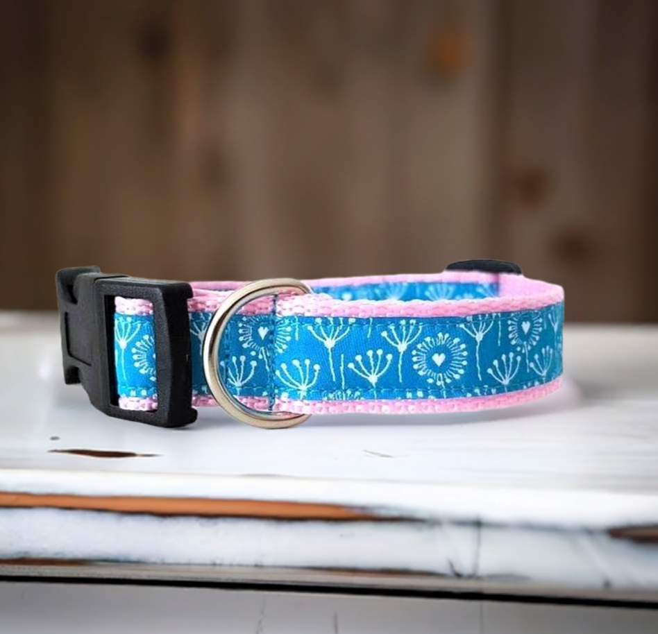 dieses bezaubernde Hundehalsband besteht aus rosafarbenen Gurtband und türkisfarbenen Web band mit Pusteblumen Motiv.