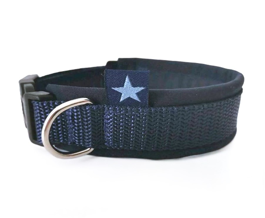 dieses tolle Hundehalsband besteht aus dunkelblauen Gurtband und Web band, gepolstert ist es mit dunkelblauen Softshell.