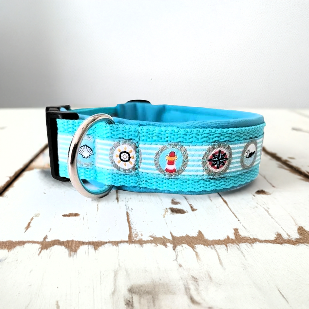 dieses tolle Hundehalsband besteht aus türkisfarbenen Gurtband und Web band mit Maritim Motiv, gepolstert ist es mit türkisfarbenen Softshell.