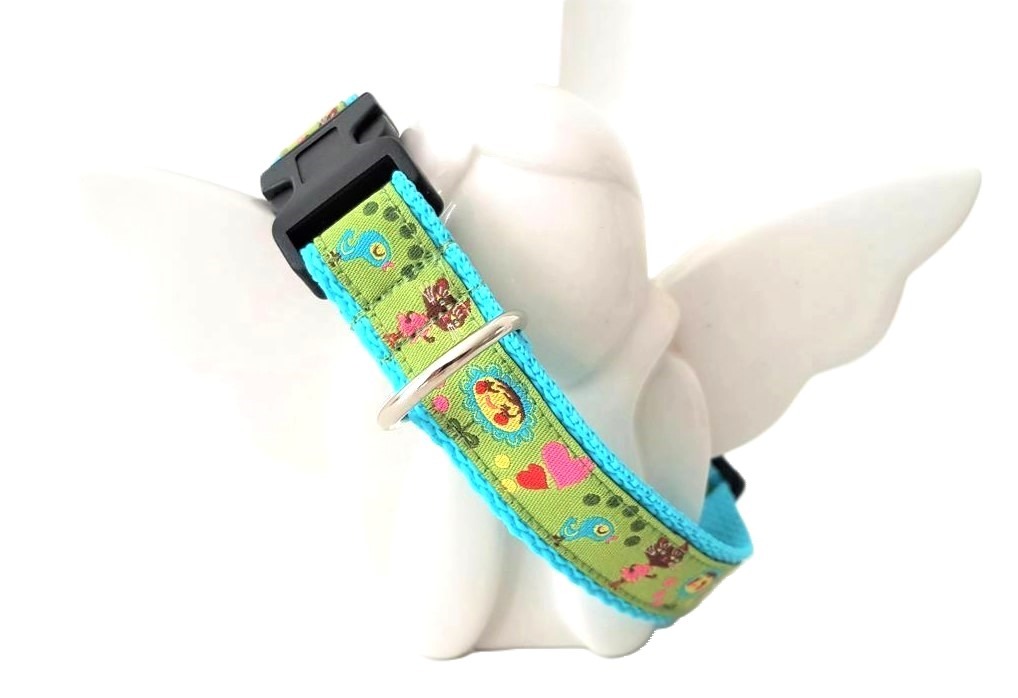 dieses süße Hundehalsband besteht aus türkisfarben Gurtband und grünen Web band mit Katzen Motiv.