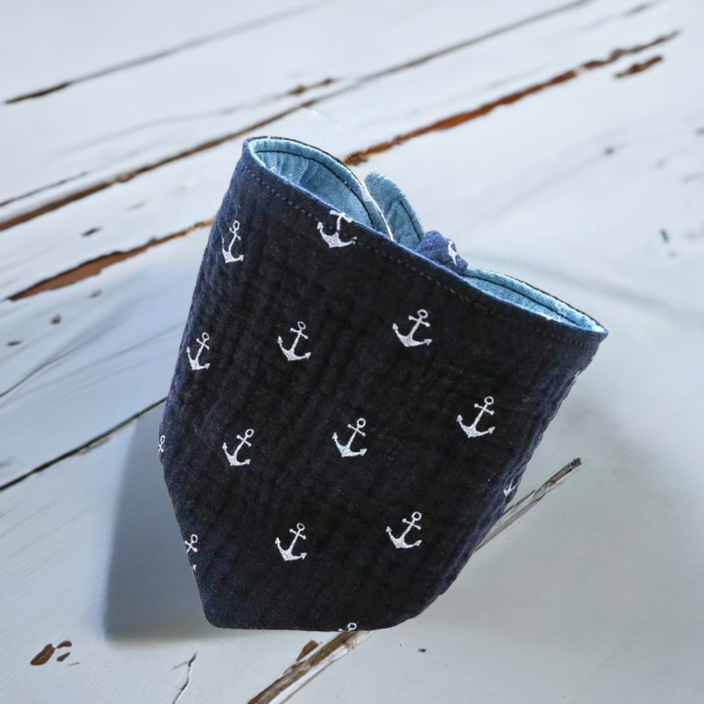 ein Hundehalstuch zum binden aus Musselin Stoff in den Farben Dunkelblau und Blau mit Anker Motiv. Das Halstuch kann von beiden Seiten getragen werden. Dein Hund sieht mit einem Halstuch einfach nur niedlich aussehen. Das Hundehalstuch gibt es in verschiedenen Größen.