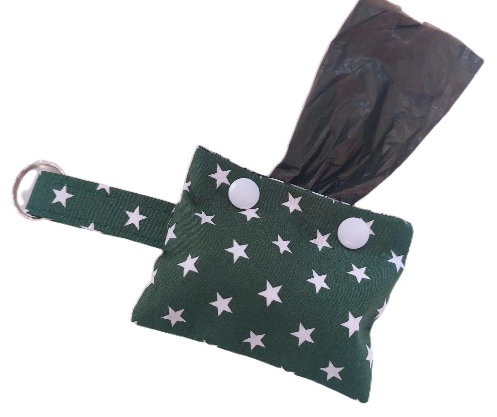 eine handgefertigte Hundekotbeuteltasche  aus Baumwollstoff grün mit weißen Sternen  und weißen Druckknöpfen.