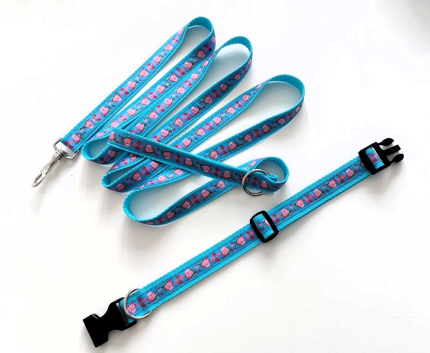 ein handgefertigtes Hundehalsband mit passender Leine aus türkisfarbigen Gurtband und Web band mit süßem Eulen Motiv. Das  Halsband ist verschließbar durch eine Steckschnalle aus Kunststoff und die dazu gehörende Leine kann an einem D-Ring befestigt werden. Die Hundeleine/Führleine (ist nicht verstellbar und mit Handschlaufe).